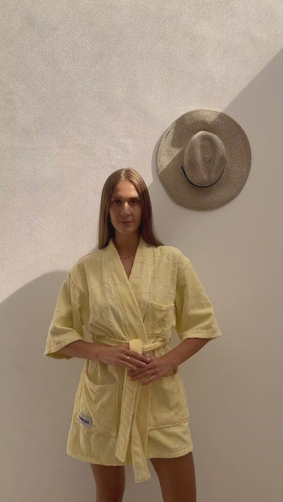 Honey Sun glows with simplicity and comfort. Its light yellow tone and 350 GSM cotton terry feel weightless and calming. With its V-cut design, understated jacquard texture and elegance, this robe invites serenity – from spa rituals to slow afternoons by the sea.