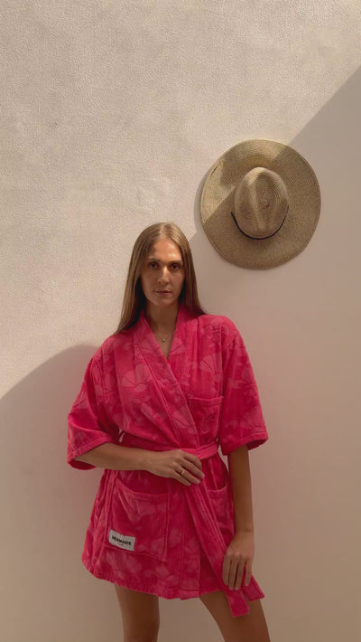 Bold and radiant, Sunset Glow mirrors the sky ablaze at the end of a desert day. Its rich pink tone, lightweight terry fabric, and V-neck elegance create a confident, contemporary beach look.
